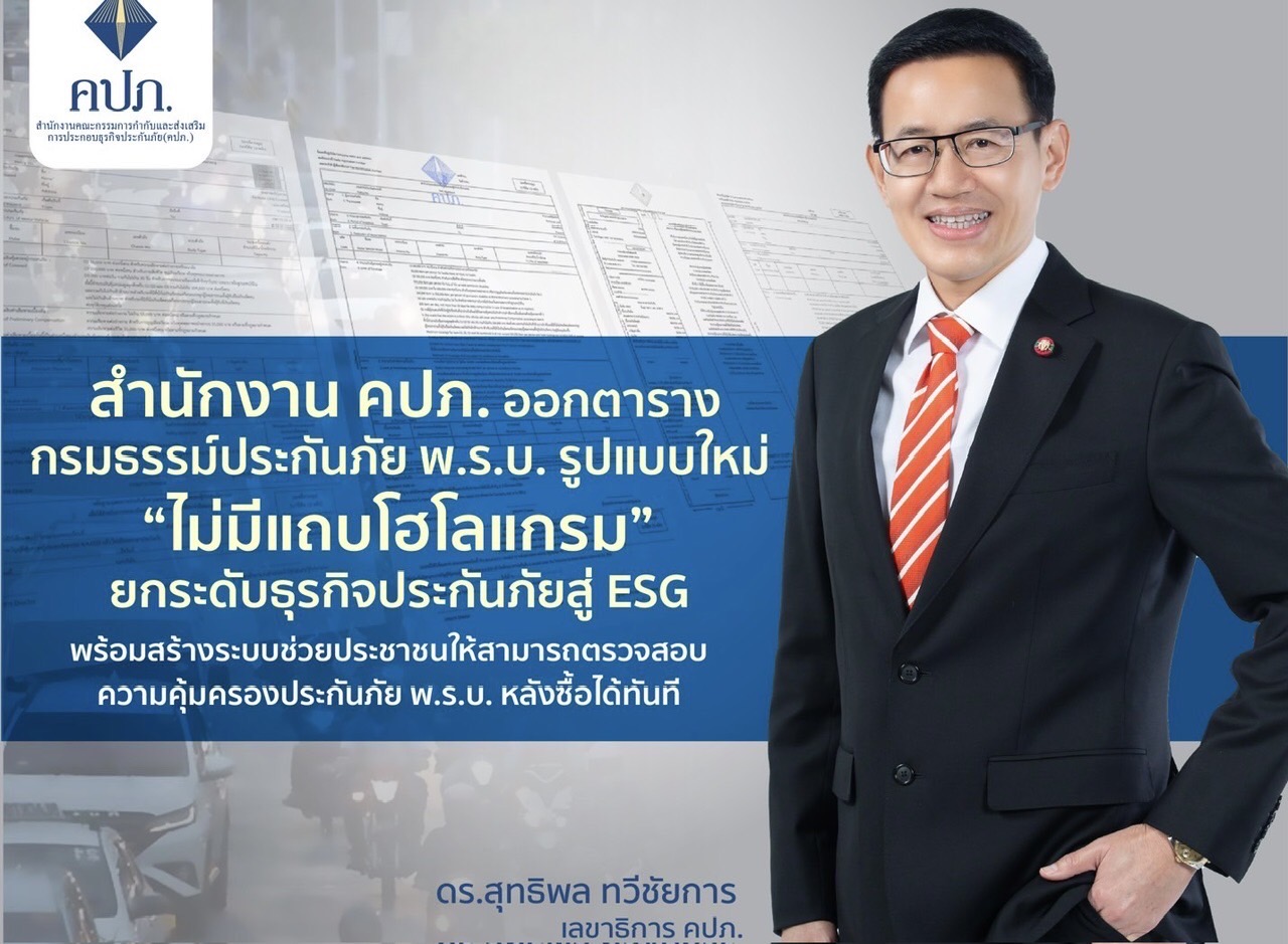 “การเพิ่มตารางกรมธรรม์ประกันภัย พ.ร.บ. รูปแบบใหม่ โดย “ไม่มีแถบโฮโลแกรม (Non-hologram)” ตามคำสั่งนายทะเบียนนี้ จะช่วยให้ประชาชนมั่นใจได้ว่า กรมธรรม์ประกันภัย พ.ร.บ. ที่บริษัทออกให้เป็นฉบับจริง และสามารถตรวจสอบความคุ้มครองตามกรมธรรม์ประกันภัย พ.ร.บ. หลังซื้อประกันภัยได้แบบRealtime ตลอดจนช่วยลดต้นทุนของการออกกรมธรรม์ประกันภัย พ.ร.บ. ให้แก่ภาคธุรกิจประกันภัยโดยการลดต้นทุนดังกล่าวจะเป็นปัจจัยสำคัญที่จะนำมาพิจารณาปรับปรุงค่าเบี้ยประกันภัย พ.ร.บ. ในอนาคต ซึ่งถือเป็นการส่งเสริมให้ธุรกิจประกันภัยขับเคลื่อนการดำเนินงานโดยคำนึงถึงแนวคิดการดำเนินธุรกิจอย่างยั่งยืน (Environmental Social and Governance : ESG) ไม่ว่าจะเป็นมิติทางสิ่งแวดล้อม (Environmental) ที่เริ่มปรับจากการออกกรมธรรม์ประกันภัย พ.ร.บ. ในรูปแบบกระดาษที่มีแถบโฮโลแกรม (Hologram) มาเป็นรูปแบบกระดาษที่ไม่มีแถบโฮโลแกรม (Non-hologram) รวมไปถึงการเลือกรับกรมธรรม์ประกันภัย พ.ร.บ. ในรูปแบบ e-Policy ซึ่งสอดคล้องกับพฤติกรรมการใช้ชีวิตของประชาชนในปัจจุบันที่ซื้อประกันภัยในรูปแบบออนไลน์และเลือกรับหลักฐานการทำประกันภัยในรูปแบบอิเล็กทรอนิกส์มากขึ้น หรือมิติทางสังคม (Social) ที่สร้างความเชื่อมั่นให้แก่ประชาชนในการตรวจสอบกรมธรรม์ประกันภัย พ.ร.บ. และความคุ้มครองตามกรมธรรม์ประกันภัย พ.ร.บ. ได้ทันทีที่ซื้อประกันภัยหรือมิติทางธรรมาภิบาล (Governance) ที่ส่งเสริมการรับประกันภัย พ.ร.บ. ให้มีความโปร่งใสและตรวจสอบได้ผ่านระบบเทคโนโลยีสารสนเทศและนวัตกรรมที่มีมาตรฐานของการรักษาความมั่นคงปลอดภัยด้านเทคโนโลยีสารสนเทศ (IT security) พร้อมทั้งสนับสนุนให้ธุรกิจประกันภัยปรับตัวเป็นดิจิทัล อันเป็นการสอดคล้องกับแผนพัฒนาการประกันภัย ฉบับที่ 4 และแผนยุทธศาสตร์สำนักงาน คปภ. ระยะ 3 ปี(พ.ศ. 2567 – 2569) อีกด้วย” เลขาธิการ คปภ. กล่าวในตอนท้าย