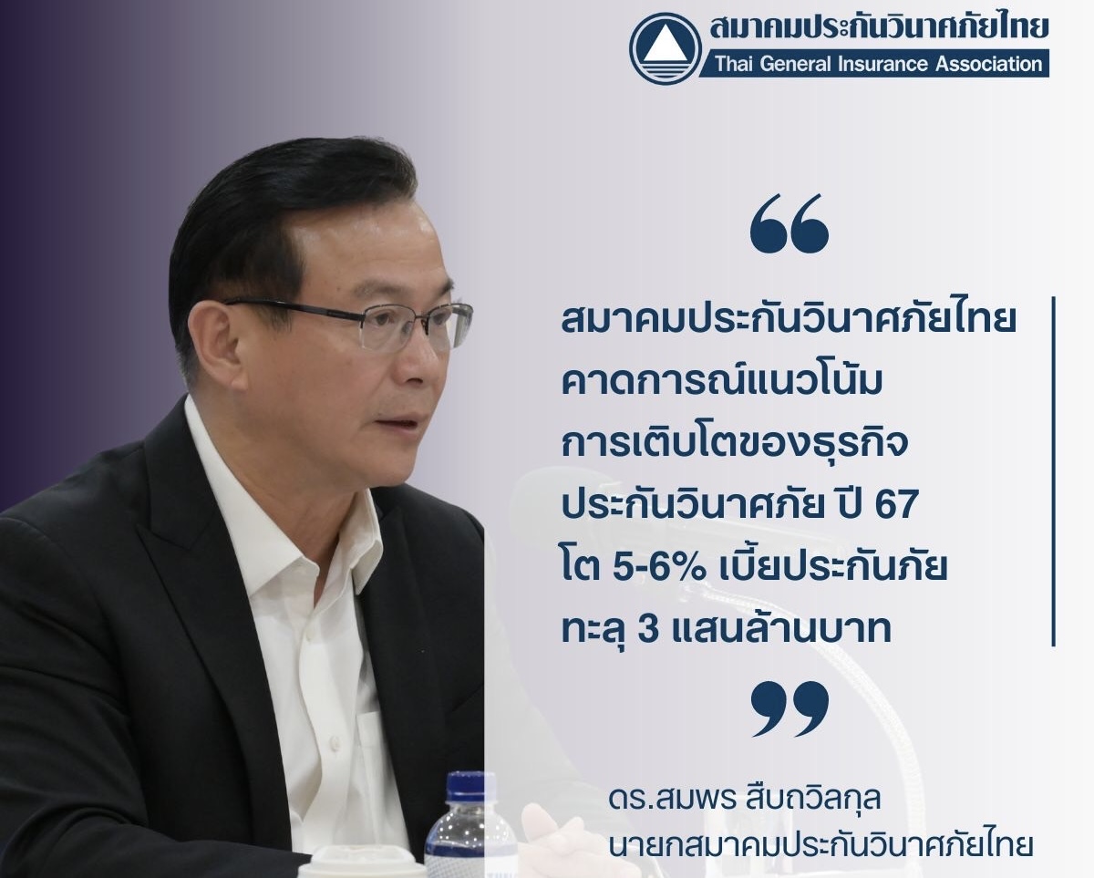 สำหรับแนวโน้มการเติบโตของธุรกิจประกันวินาศภัย ปี 2567 คาดการณ์ว่าจะมีอัตราการเติบโตราว 5.0%-6.0% เบี้ยประกันภัยรับโดยตรงรวม 301,050-303,900 ล้านบาท จากยอดขายรถยนต์ไฟฟ้าที่เพิ่มขึ้นอย่างต่อเนื่องด้วยแรงสนับสนุนของภาครัฐ อาจทำให้ยอดขายทะลุ 100,000 คัน บวกกับประชาชนตระหนักถึงความสำคัญของการทำประกันภัยสุขภาพ เนื่องมาจากแนวโน้มค่ารักษาพยาบาลที่เพิ่มสูงขึ้น และจำนวนนักท่องเที่ยวที่เพิ่มมากขึ้นถึง 2 เท่า ส่งผลให้ในปีหน้ามีแนวโน้มการเติบโตอย่างต่อเนื่อง