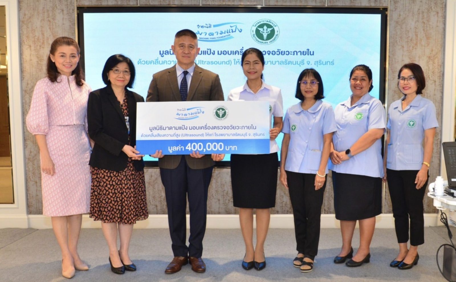 26 ธันวาคม 2566 – นางนวลพรรณ ล่ำซำ กรรมการผู้จัดการและประธานเจ้าหน้าที่บริหาร บริษัท เมืองไทยประกันภัย จำกัด (มหาชน) หรือ MTI และในฐานะประธานกรรมการ มูลนิธิมาดามแป้ง ได้มอบอุปกรณ์ทางการแพทย์ เครื่องตรวจอวัยวะภายในด้วยคลื่นเสียงความถี่สูง (Ultrasound) มูลค่า 400,000 บาท แก่โรงพยาบาลรัตนบุรี จังหวัดสุรินทร์ โดยมี พ.ต.อ.ณรัชต์ เศวตนันทน์ เป็นผู้แทนทำการส่งมอบ และมี พญ.จุฑารัตน์ บุตรดีขันธ์ ผู้อำนวยการรพ. รัตนบุรี และคณะ เป็นผู้รับมอบ โดยมี นางปุณฑริกา ใบเงิน กรรมการและเลขานุการ, ร.อ.หญิง ชญาดา หนีพาล กรรมการและเหรัญญิก มูลนิธิฯ ร่วมเป็นสักขีพยาน ณ ห้องประชุมชั้น 14 อาคารเมืองไทย-ภัทร คอมเพล็กซ์