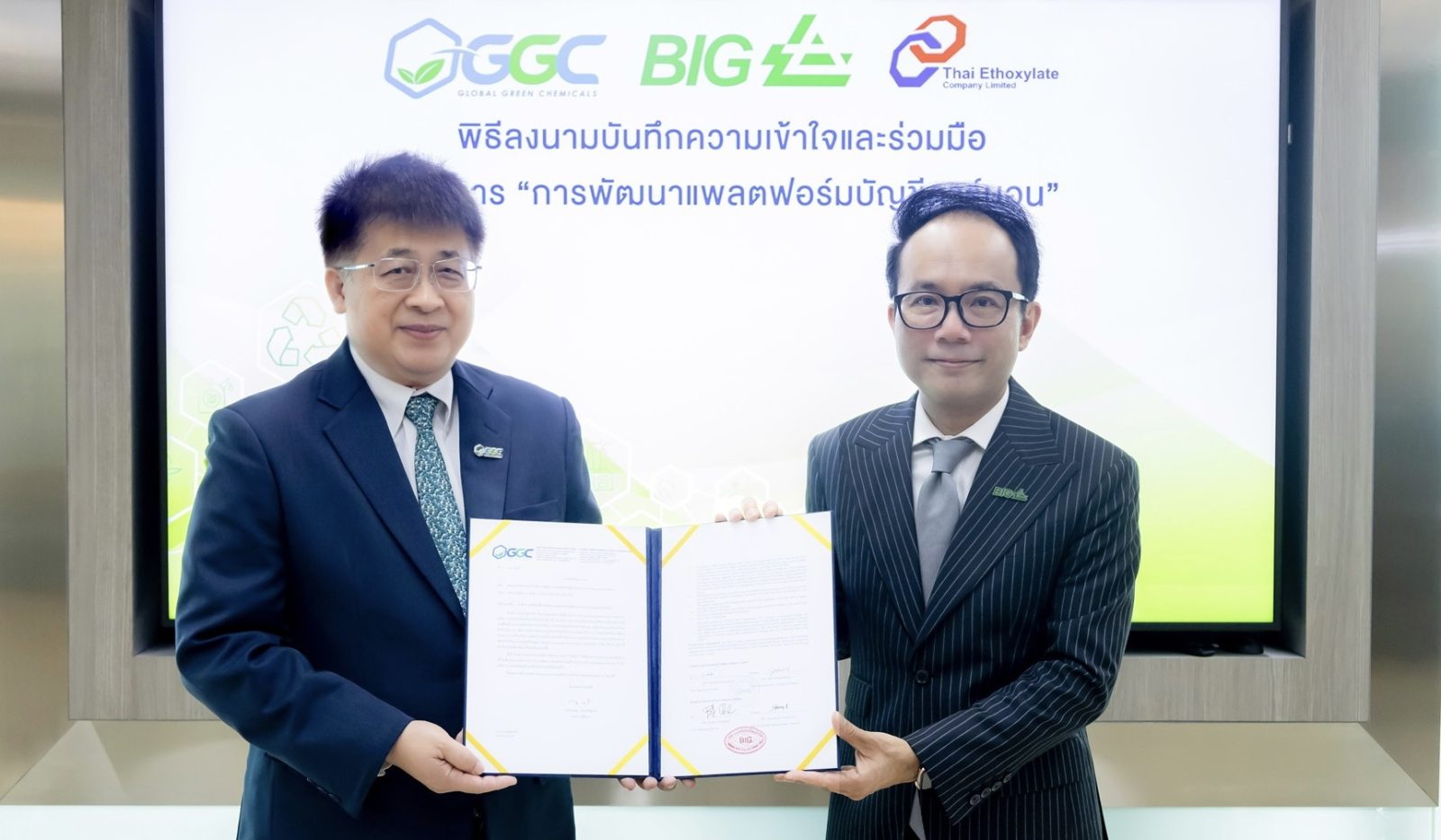 กรุงเทพฯ – 9 เมษายน 2567 บริษัท โกลบอลกรีนเคมิคอล จำกัด (มหาชน) หรือ “GGC” ร่วมกับ บีไอจี ร่วมลงนามบันทึกความเข้าใจและร่วมมือ โครงการ “การพัฒนาแพลตฟอร์มบัญชีคาร์บอน” เพื่อแลกเปลี่ยนความรู้และความเข้าใจ ร่วมพัฒนาและนำแพลตฟอร์มไปใช้ในการบริหารจัดการก๊าซเรือนกระจกขององค์กร จากการดำเนินการดังกล่าว ทำให้บริษัทฯ ภายใต้ความร่วมมือนี้ สามารถเพิ่มขีดความสามารถและประสิทธิภาพของบุคลากรของบริษัทฯ ในการจัดทำรายงานด้านสิ่งแวดล้อม การกำหนดและทบทวนกลยุทธ์องค์กรที่เกี่ยวข้องกับการลดการปล่อยก๊าซเรือนกระจกในกระบวนการผลิต การพัฒนาผลิตภัณฑ์คาร์บอนต่ำ รวมถึงทิศทางการดำเนินการธุรกิจใหม่ในอนาคตได้อย่างเป็นระบบและเป็นไปตามมาตรฐานสากล
