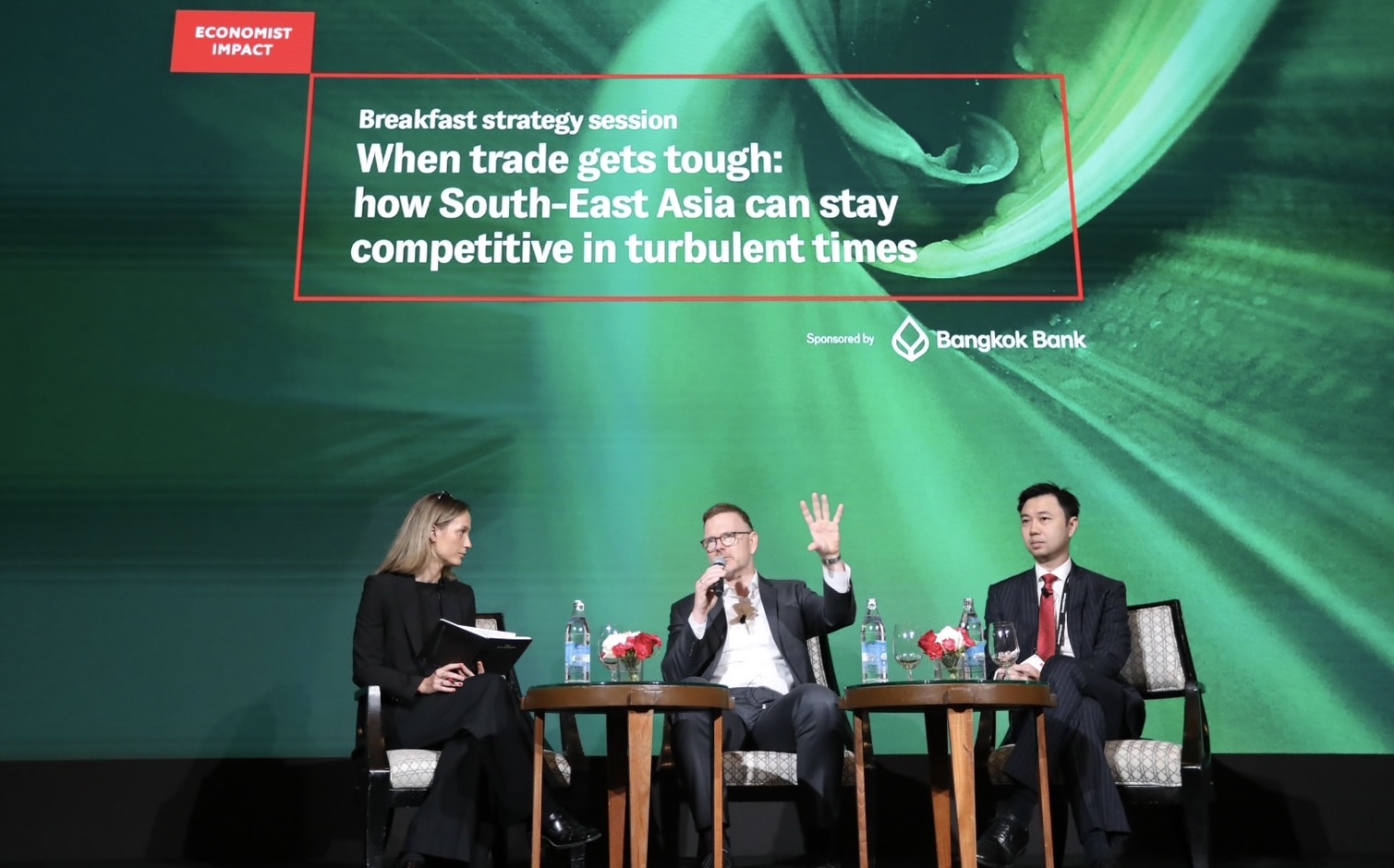 สำหรับการจัดงาน “Economist Impact: Sustainability Week Asia 2025” โดยนิตยสาร The Economist ธนาคารกรุงเทพถือเป็นธนาคารพาณิชย์เพียงแห่งเดียวที่ร่วมเป็นผู้สนับสนุนหลัก เพื่อส่งเสริมบทบาทของธนาคารไทยในเวทีเศรษฐกิจระดับภูมิภาค ทั้งเป็นการตอกย้ำจุดยืนการเป็นธนาคารชั้นนำและให้ความสำคัญด้านการพัฒนาอย่างยั่งยืน ภายในงาน นอกจากการฉายภาพมุมมองของธนาคารกรุงเทพ ‘ธนาคารชั้นนำระดับภูมิภาค’ และเจาะลึกถึงแนวทางการพัฒนาธุรกิจและลูกค้าผู้ประกอบการให้มีความยั่งยืนยิ่งขึ้นในระดับสากล ในเวทีดังกล่าว ธนาคารยังได้จัดเสวนาเชิงกลยุทธ์ ให้กับลูกค้าของธนาคารโดยเฉพาะ เพื่อร่วมอัปเดตสถานการณ์และแลกเปลี่ยนความคิดเห็นในประเด็นการรักษาขีดความสามารถการแข่งขันทางธุรกิจในภูมิภาคเอเชียตะวันออกเฉียงใต้ ท่ามกลางปัจจัยผลกระทบด้านภาษีศุลกากรที่เพิ่มขึ้นและการหยุดชะงักทางการค้า โดย Mr. Sebastian Eckardt, Practice Manager for Macroeconomics, Trade and Investment, East Asia and Pacific, World Bank นายอิษฎา หิรัญวิวัฒน์กุล กรรมการผู้จัดการและหุ้นส่วนอาวุโส บริษัท บอสตันคอนซัลติ้ง กรุ๊ป (ประเทศไทย) จำกัด(BCG)./
