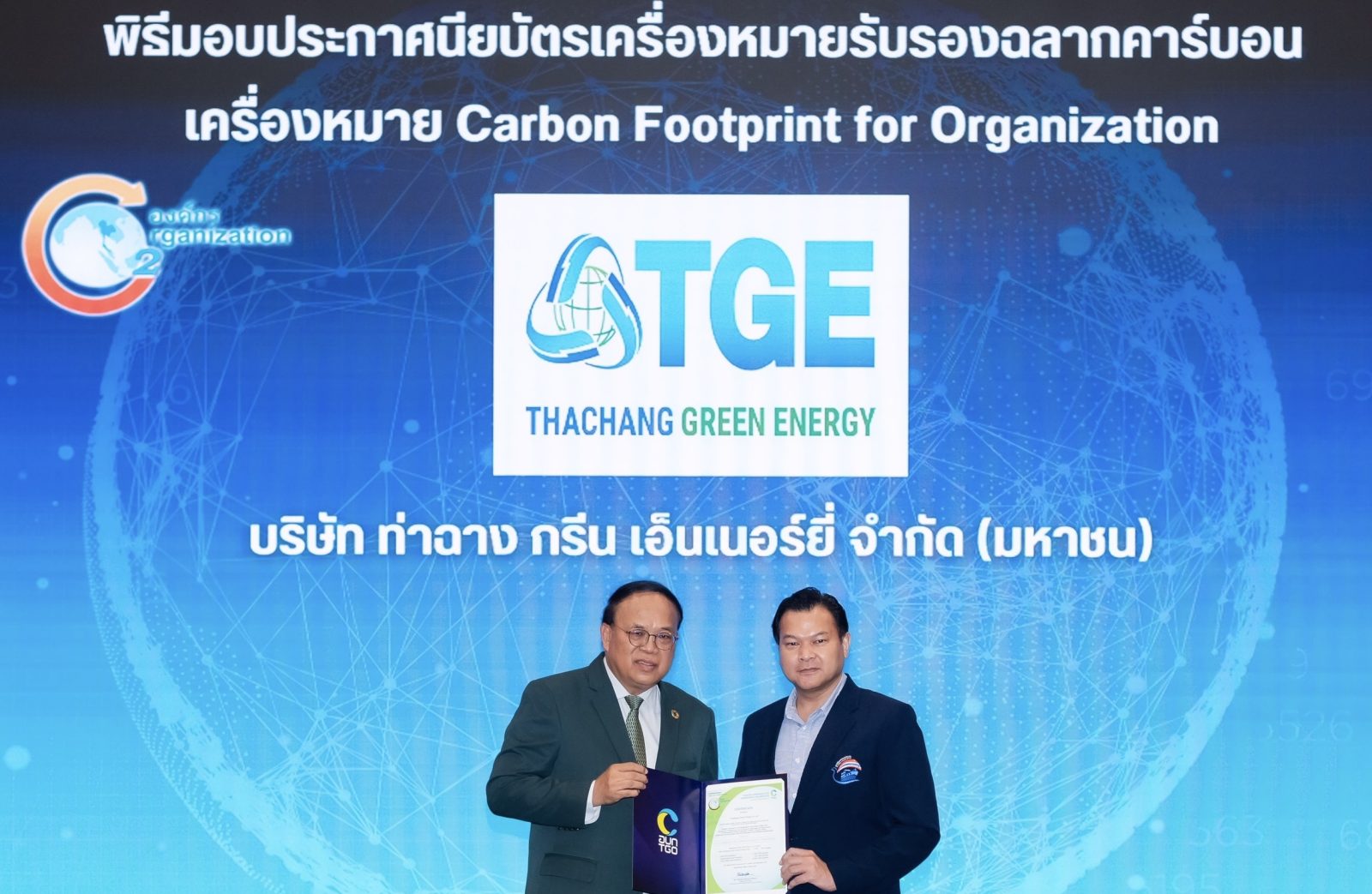 คุณสืบตระกูล บินเทพ (ขวา) ประธานเจ้าหน้าที่บริหาร บริษัท ท่าฉาง กรีน เอ็นเนอร์ยี่ จำกัด (มหาชน) หรือ TGE รับมอบประกาศนียบัตรเครื่องหมายรับรองฉลากคาร์บอนขององค์กร (Carbon Footprint for Organization: CFO) จาก ดร.วิจารย์ สิมาฉายา (ซ้าย) ประธานกรรมการองค์การบริหารจัดการก๊าซเรือนกระจก (TGO) โดยพิธีมอบจัดขึ้น ณ สถาบันเพื่อการยุติธรรมแห่งประเทศไทย (TIJ) เมื่อเร็ว ๆ นี้